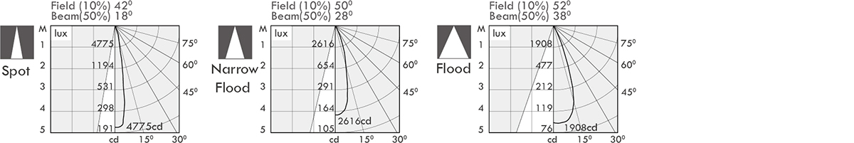 | Luminaire flux (lm) | Power consumption (w) | LED drive (w) | cd / 18o | 28o | 38o |