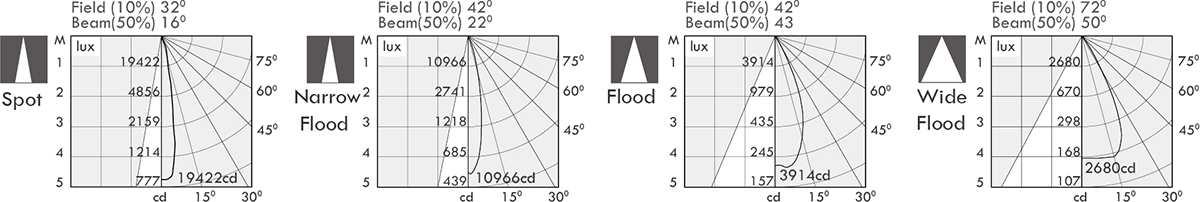 | Luminaire flux (lm) | Power consumption (w) | LED drive (w) | cd / 16o | 22o | 43o | 50o |