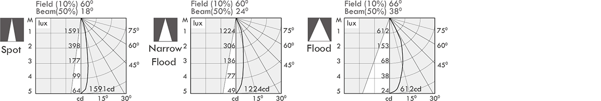 | Luminaire flux (lm) | Power consumption (w) | LED drive (w) | cd / 18o | 24o | 38o |