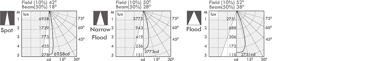 | Luminaire flux (lm) | Power consumption (w) | LED drive (w) | cd / 18o | 28o | 38o |