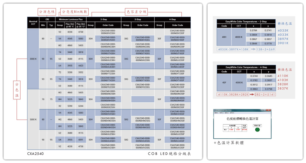 LED的光色於 CIE1931 色彩空間上黑體輛射線(BBL)上各色溫落點為中心,以麥克亞當橢圓(MacAdam ellipse)分出數個Step來標示光色差異,數字越小差異就越小、越精準,此即色容差(SDCM)控制。