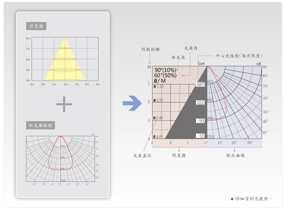 燈具在1M半徑立體球中心每隔2.5°或5°用經緯度所測出的光强度,用照度計所測出的發光強度。若間隔繪製其光強度,連结的曲線稱為『配光曲線』此光強度分布稱為強光,亦稱作光強分佈圖。配光曲線圖上的各個點,代表著燈具在此角度方向上的發光強度。